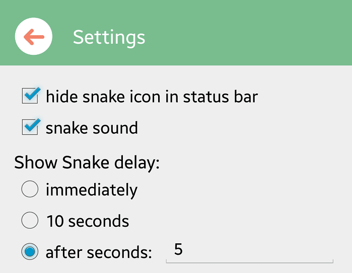 3.  Open dan lakukan setting pada aplikasi tersebut. Anda bisa setting waktunya, saya lebih suka memunculkan ularnya hanya dalam waktu 5 detik. Karena itu saya setting seperti gambar berikut ini: